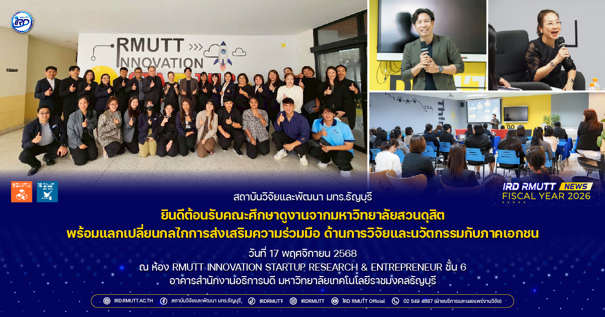 สถาบันวิจัยและพัฒนา มทร.ธัญบุรี ร่วมกับ สำนักงานนวัตกรรมแห่งชาติ (สนช.) ได้จัดงานเปิดตัวและประชาสัมพันธ์ ทุนอุดหนุนโครงการนวัตกรรมที่จำเป็นต่อการพัฒนาประเทศ (Mandatory Grant) ปีงบประมาณ 2567 การสนับสนุนผู้ประกอบการที่ประกอบธุรกิจนวัตกรรมในด้านเศรษฐกิจหมุนเวียนและเศรษฐกิจคาร์บอนต่ำ และด้านพลังงานสะอาด ผ่านกลไกการให้ทุนโครงการนวัตกรรมแบบมุ่งเป้า หรือ Thematic Innovation