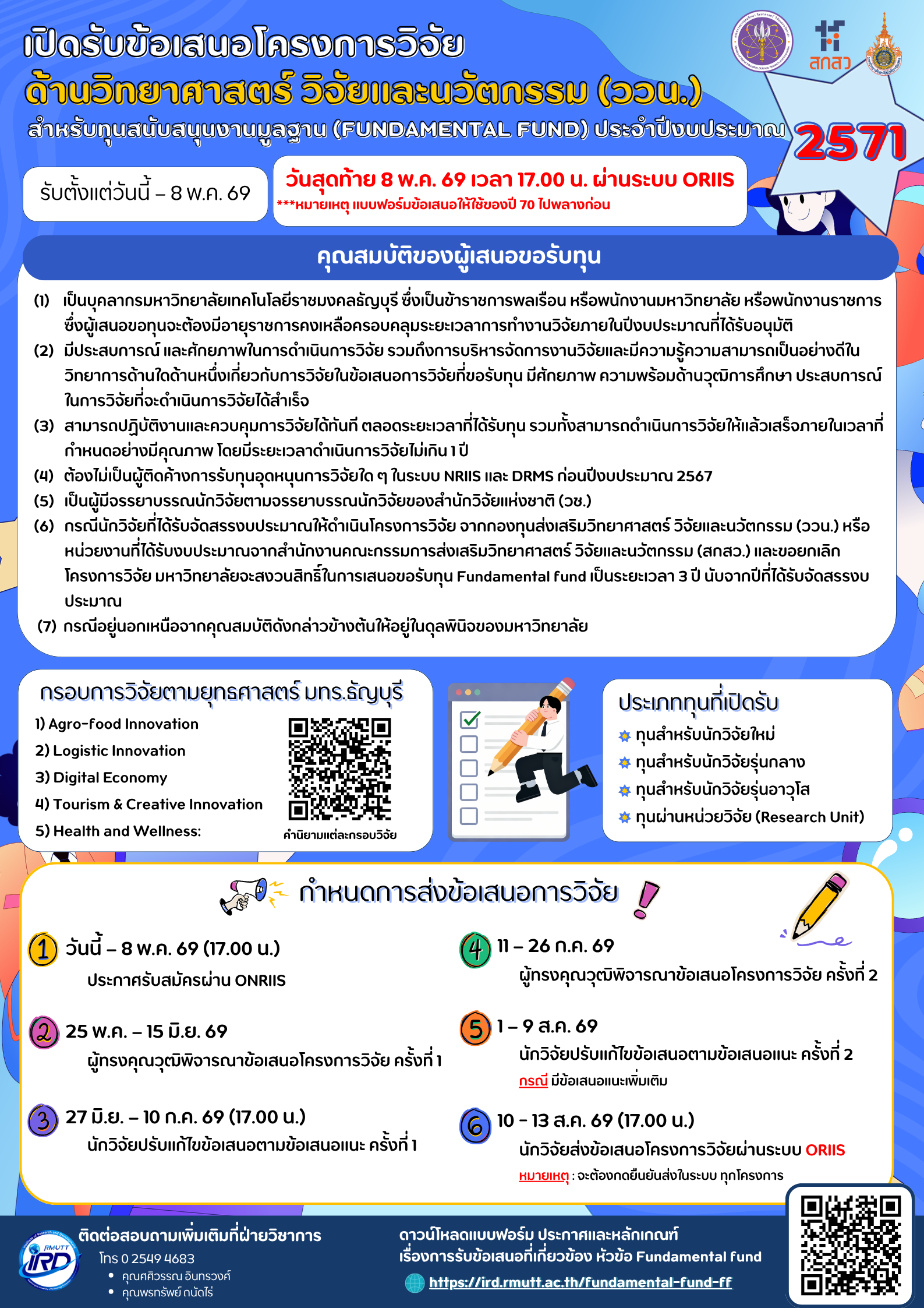 1. ประกาศ มทร.ธัญบุรี เรื่อง การจัดสรรงบประมาณและแนวทางการบริหารงานโครงการด้าน ววน. ประเภททุน FF ประจำปีงบประมาณ 2569 (Update: 17/10/2568) (1.4 MB)
