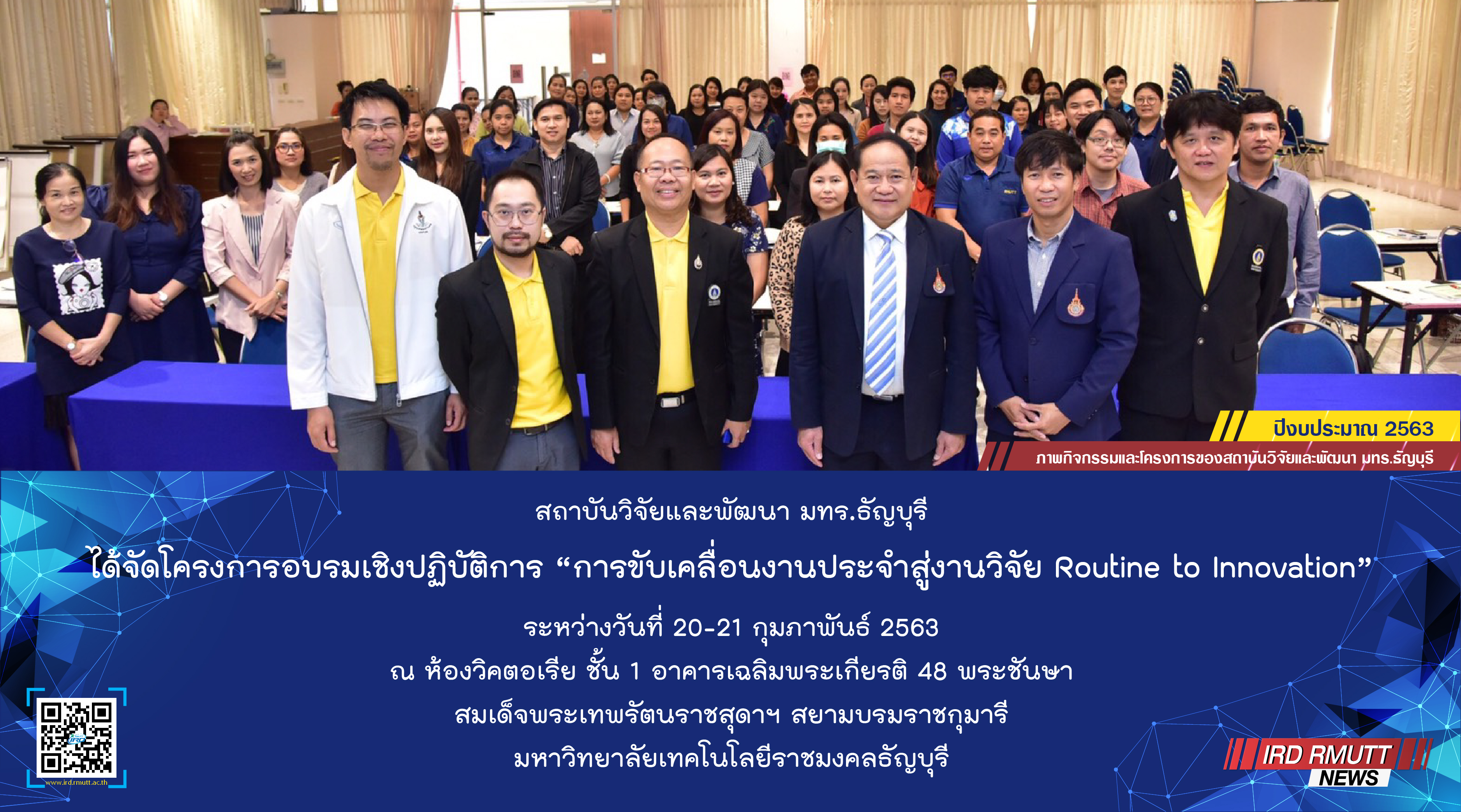 สถาบันวิจัยและพัฒนา มทร.ธัญบุรี ได้จัดโครงการอบรมเชิงปฏิบัติการ “การขับเคลื่อนงานประจำสู่งานวิจัย Routine to Innovation” เพื่อส่งเสริมและสนับสนุนให้บุคลากรสายสนับสนุนมีความรู้ ความเข้าใจเกี่ยวกับกระบวนการวิจัย และสามารถเขียนข้อเสนอโครงการวิจัยจากงานประจำเพื่อขอรับงบประมาณสนับสนุนในการดำเนินงานวิจัยและเป็นการสร้างผลงานวิจัยที่จะนำไปสู่การพัฒนาประสิทธิภาพ การปฏิบัติงาน และประสิทธิภาพขององค์กร พร้อมทั้งเป็นการส่งเสริมให้บุคลากรนำผลงานวิจัยไปเป็นผลงานทางวิชาการในการขอรับการประเมินความก้าวหน้าในสายอาชีพ โดยมี ผศ.ดร.สมหมาย ผิวสอาด รักษาราชการแทนอธิการบดี มทร.ธัญบุรี เป็นประธานเปิดโครงการ พร้อมบรรยายพิเศษ เกี่ยวกับบทบาทของบุคลากรสายสนับสนุนต่อการพัฒนามหาวิทยาลัย พร้อมกับ ผศ.ดร.เกียรติศักดิ์ แสงประดิษฐ์ รองผู้อำนวยการสถาบันวิจัยและพัฒนา ได้รับมอบหมายจากผู้อำนวยการสถาบันวิจัยและพัฒนา ให้เป็นผู้แทนบรรยาย เรื่อง หลักเกณฑ์การเสนอขอรับการสนับสนุนทุนการพัฒนางานประจำสู่งานวิจัย