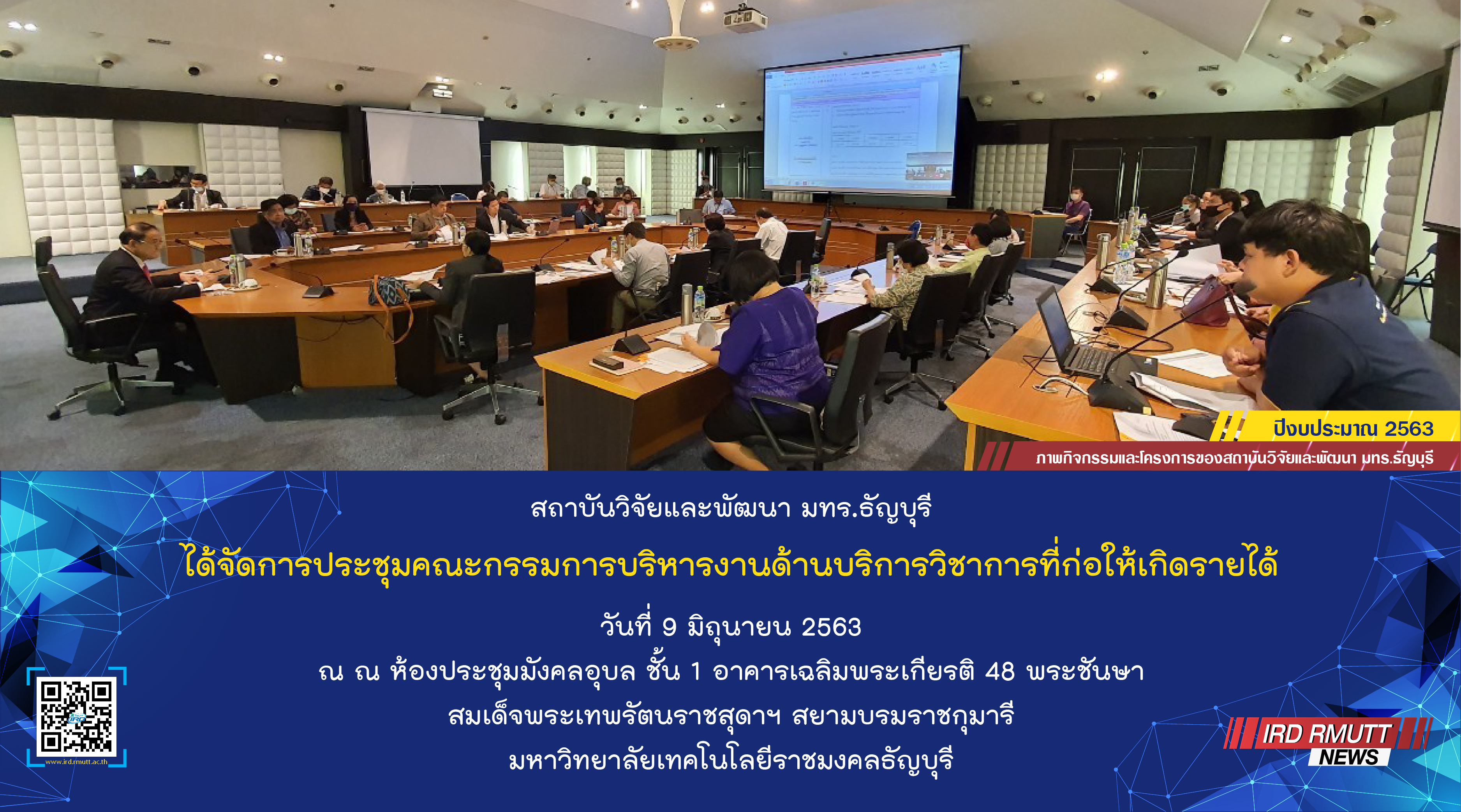 สถาบันวิจัยและพัฒนา มทร.ธัญบุรี ได้จัดการประชุมคณะกรรมการบริหารงานด้านบริการวิชาการที่ก่อให้เกิดรายได้ โดยมี ผศ.ดร.สมหมาย ผิวสอาด อธิการบดีมหาวิทยาลัย เป็นประธาน พร้อมกับรองอธิการบดี ทั้ง 2 ท่าน และผู้ช่วยอธิการบดี ได้แก่ รศ.ดร.กฤษณ์ชนม์ ภูมิกิตติพิชญ์ ผศ.อภิชาติ ไก่ฟ้า และ ผศ.ดร.สรพงษ์ ภวสุปรีย์
