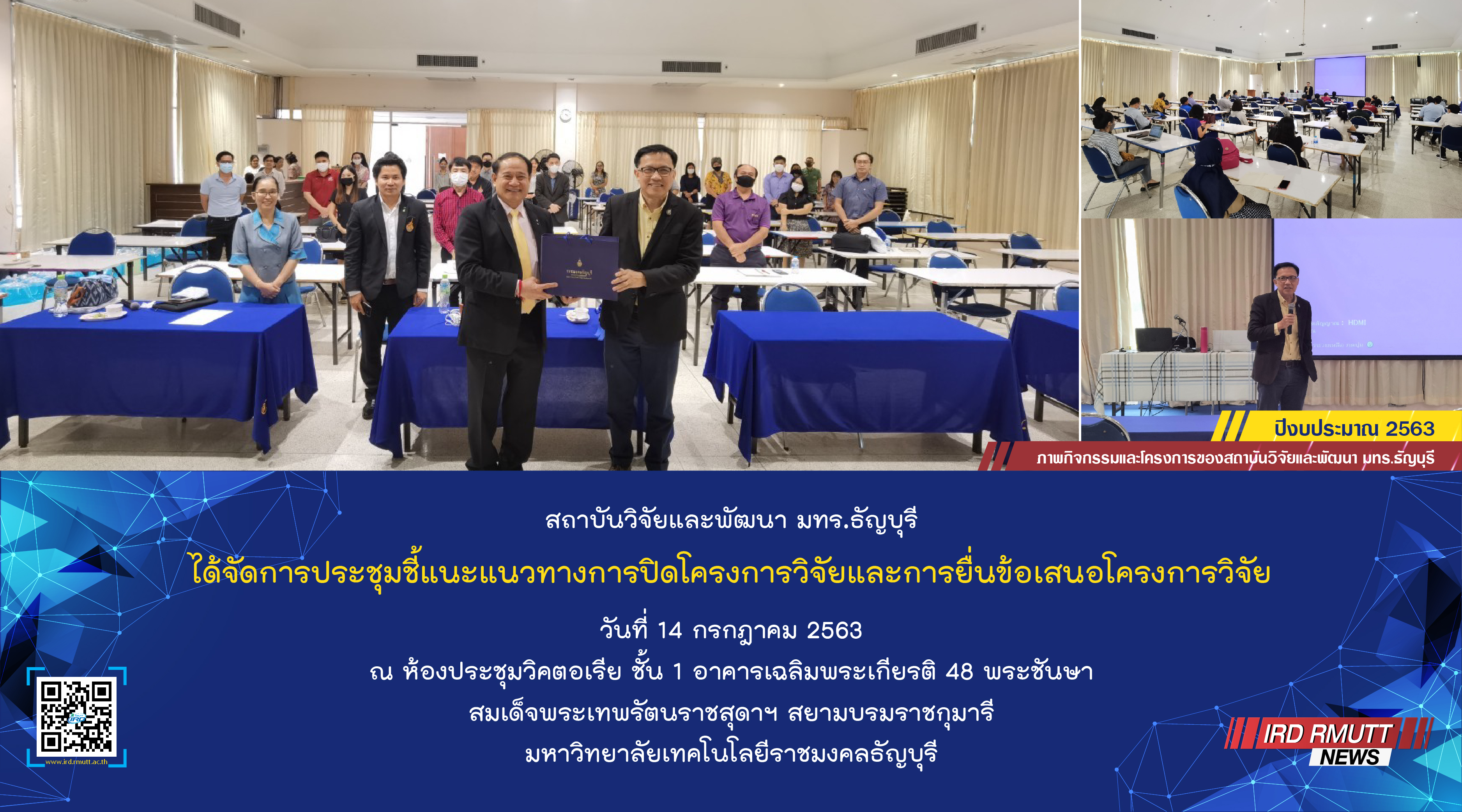 สถาบันวิจัยและพัฒนา มทร.ธัญบุรี ได้จัดการประชุมชี้แนะแนวทางการปิดโครงการวิจัยและการยื่นข้อเสนอโครงการวิจัย นำโดย ผศ.ดร.สมหมาย ผิวสอาด อธิการบดี มทร.ธัญบุรี เป็นประธานและเปิดการประชุม พร้อมกับ รศ.ดร.กฤษณ์ชนม์ ภูมิกิตติพิชญ์ รองอธิการบดี และ ผศ.ดร.สรพงษ์ ภวสุปรีย์ ผู้ช่วยอธิการบดี ซึ่งการประชุมครั้งนี้จะมุ่งเน้นนักวิจัยที่ได้รับทุนพัฒนาศักยภาพในการทำงานวิจัยของอาจารย์รุ่นใหม่ (MRG) ทุนส่งเสริมนักวิจัยรุ่นใหม่ (TRG) และผู้ที่ประสงค์ยื่นขอทุน MRG และ TRG ในปี 2564