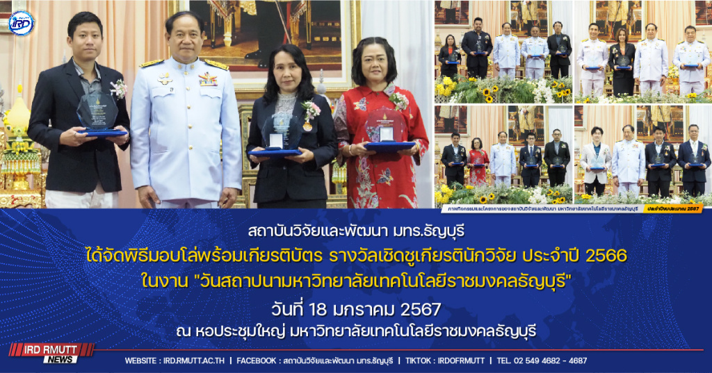 สถาบันวิจัยและพัฒนา มทร.ธัญบุรี ได้จัดพิธีมอบเข็มกลัดทอง และ โล่พร้อมเกียรติบัตร รางวัลเชิดชูเกียรตินักวิจัย ประจำปี 2566 ในงาน “วันสถาปนามหาวิทยาลัยเทคโนโลยีราชมงคลธัญบุรี” โดยได้รับเกียรติจาก รศ.ดร.สมหมาย ผิวสอาด อธิการบดี มทร.ธัญบุรี เป็นผู้มอบเข็มกลัด และโล่พร้อมเกียรติบัตร พร้อมกับ รศ.ดร.เกียรติศักดิ์ แสงประดิษฐ์ ผู้อำนวยการสถาบันวิจัยและพัฒนา และรองผู้อำนวยการสถาบันวิจัยและพัฒนา ทั้ง 2 ท่าน ได้แก่ รศ.ดร.อมร ไชยสัตย์, ผศ.ดร.พุทธิวัต สิงห์ดง มอบช่อดอกไม้แสดงความยินดีกับนักวิจัย