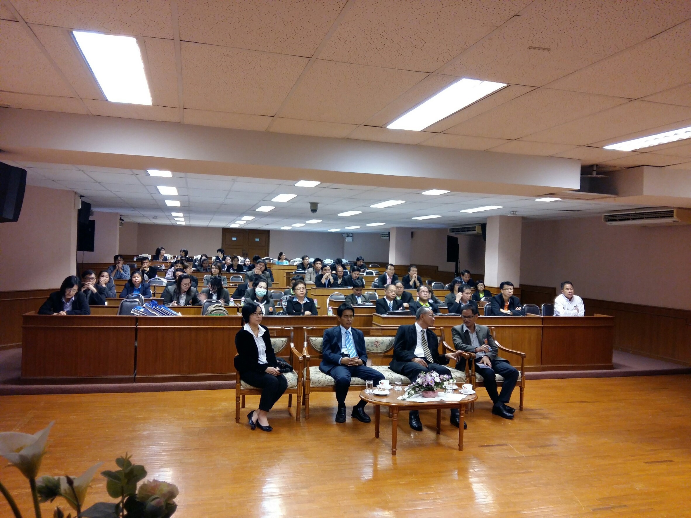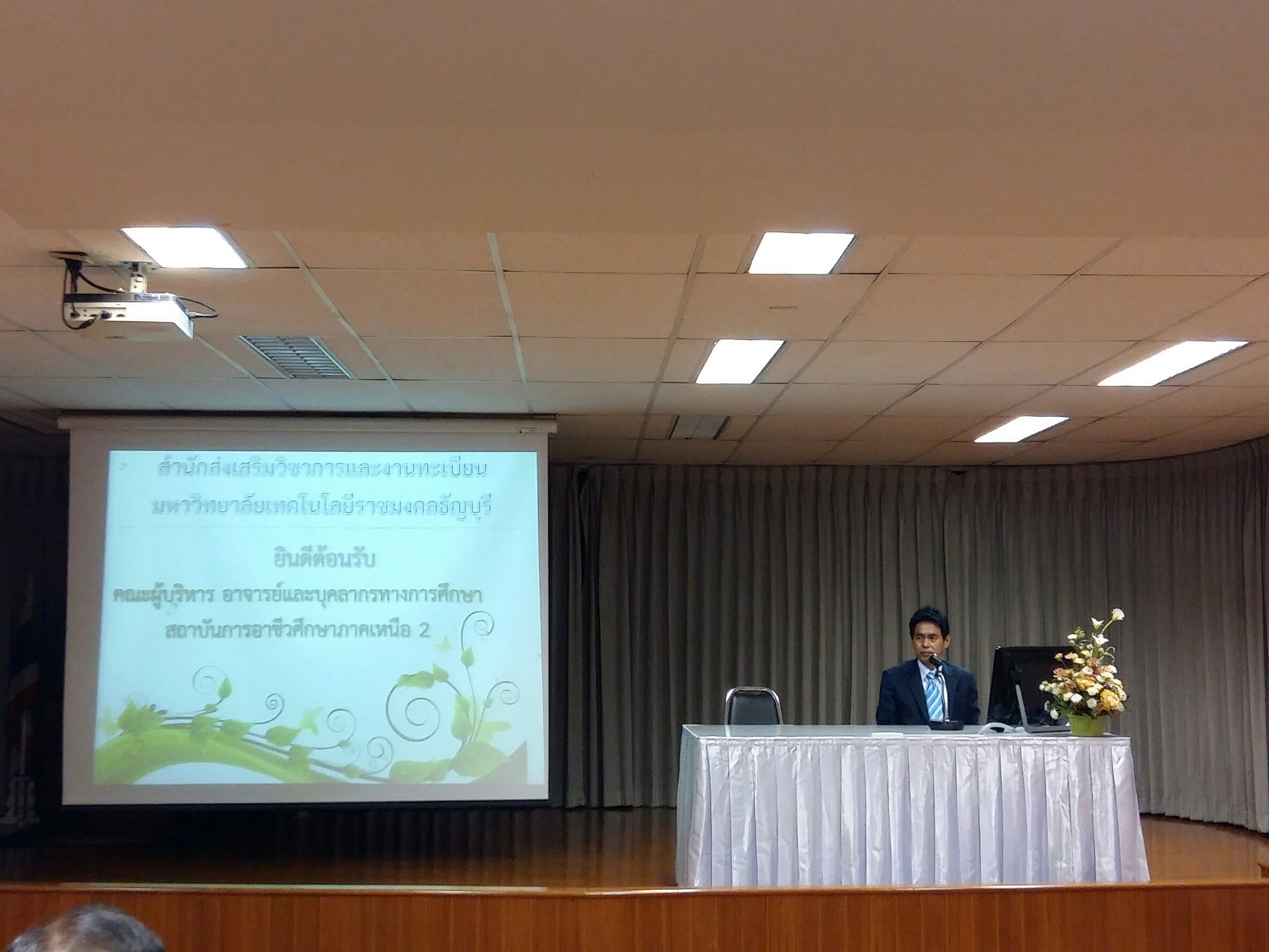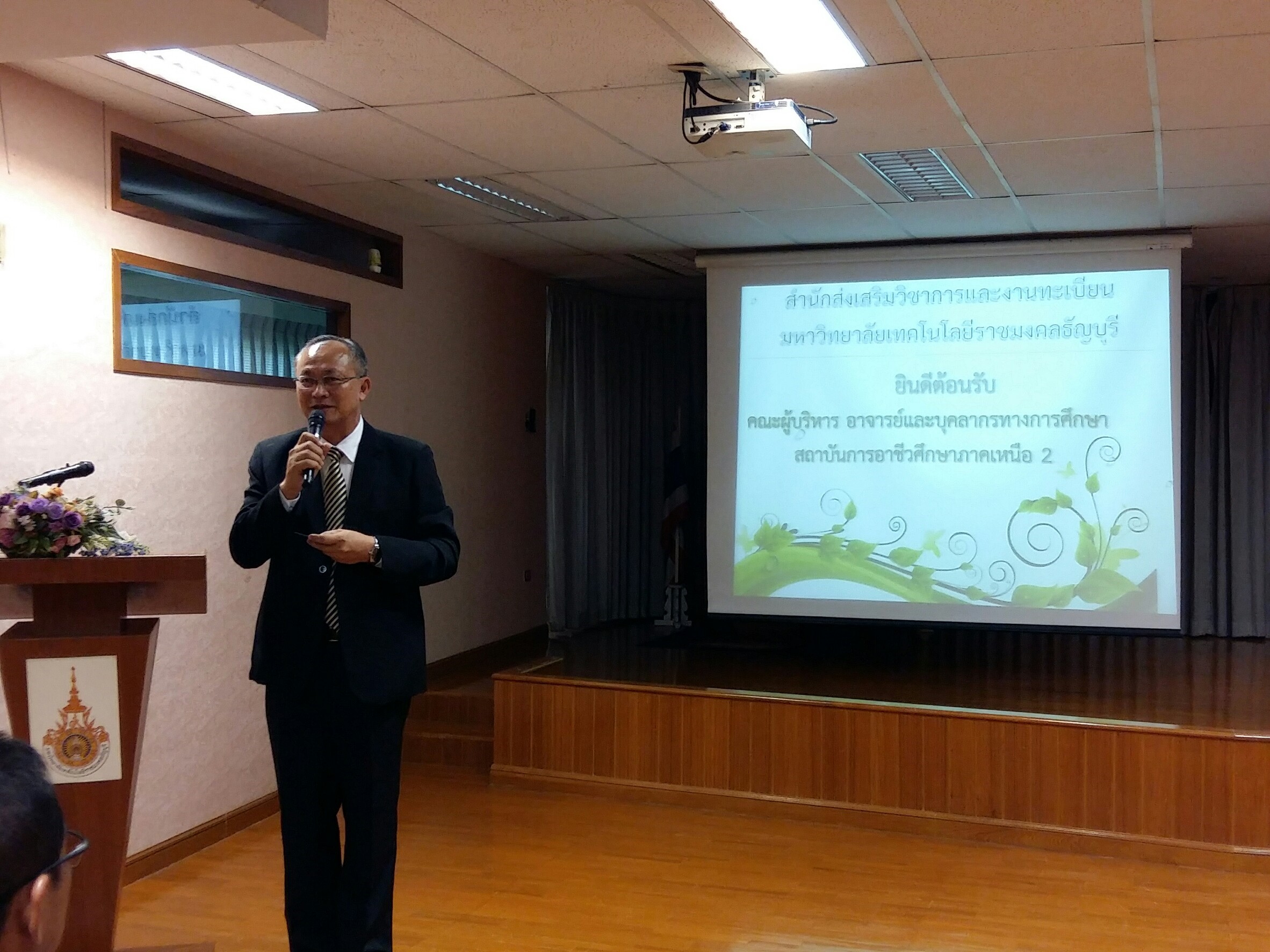 ผู้ช่วยศาสตราจารย์ไพบูลย์ แย้มเผื่อน ผู้ช่วยอธิการบดี มหาวิทยาลัยเทคโนโลยีราชมงคลธัญบุรี พร้อมด้วยคณะผู้บริหาร กล่าวต้อนรับ ดร.อุดม รูปดี ผู้อำนวยการสถาบันการอาชีวศึกษาภาคเหนือ 2 พร้อมด้วยคณะผู้บริหาร ครูและบุคลากรทางการศึกษา สถาบันการอาชีวศึกษาภาคเหนือ 2 ของสถานศึกษาในสังกัด จังหวัดเชียงราย พะเยา แพร่ และน่าน ในโอกาสที่ได้เดินทางมาศึกษาดูงานวิชาการและวิจัย เพื่อพัฒนาการบริหารงานการจัดการเรียนการสอนในระดับปริญญาตรี ในวันที่ 14 กรกฎาคม 2559 ณ มหาวิทยาลัยเทคโนโลยีราชมงคลธัญบุรี จ.ปทุมธานี