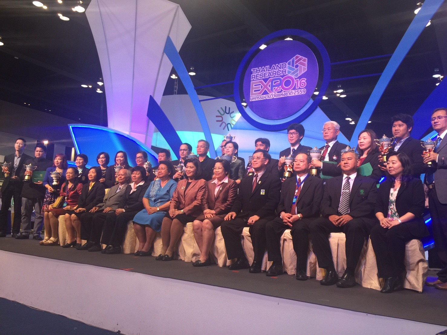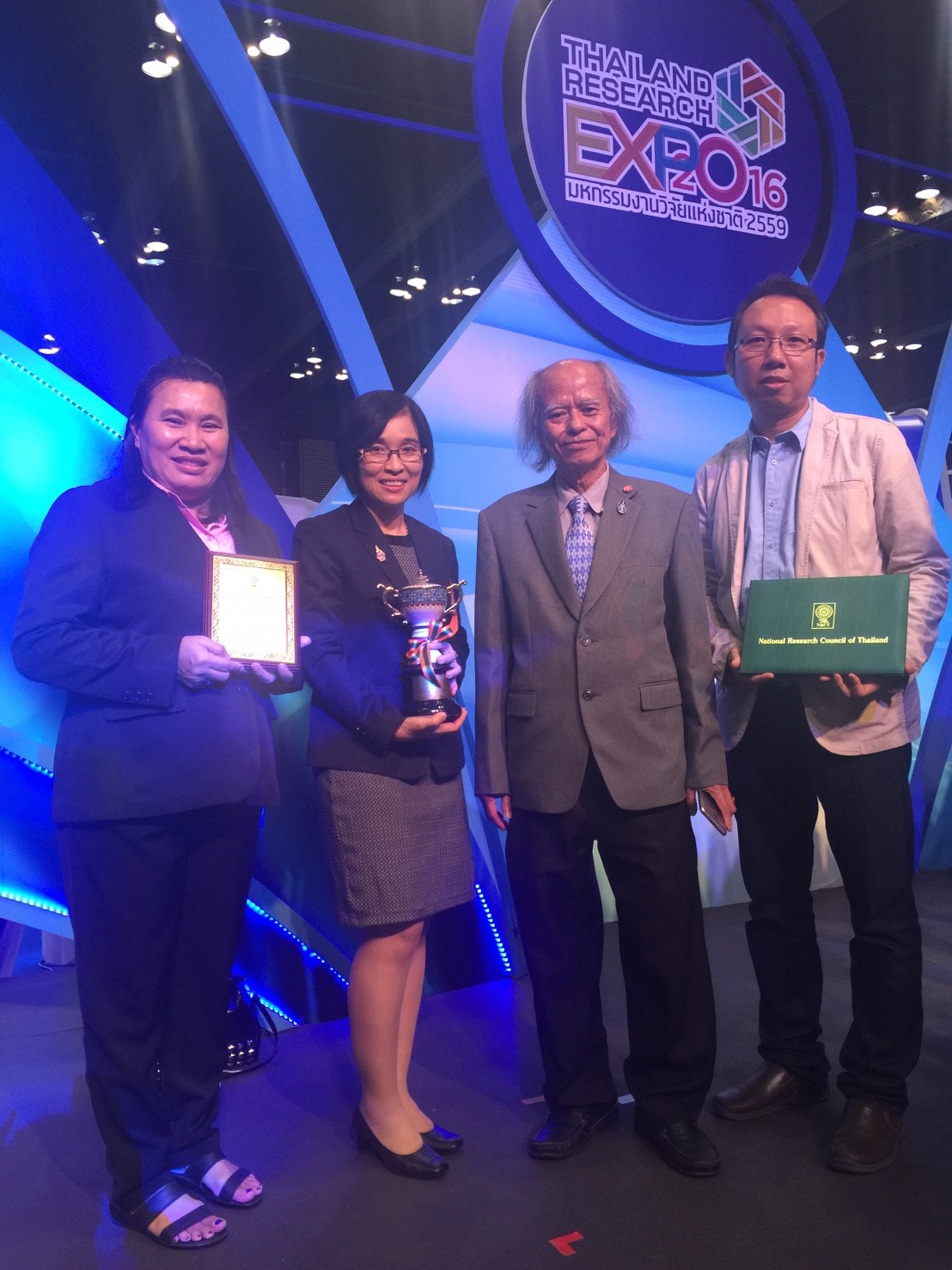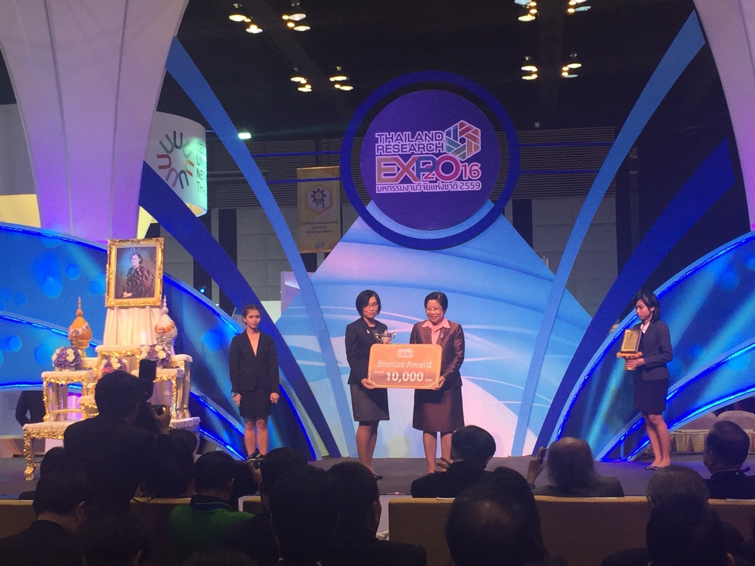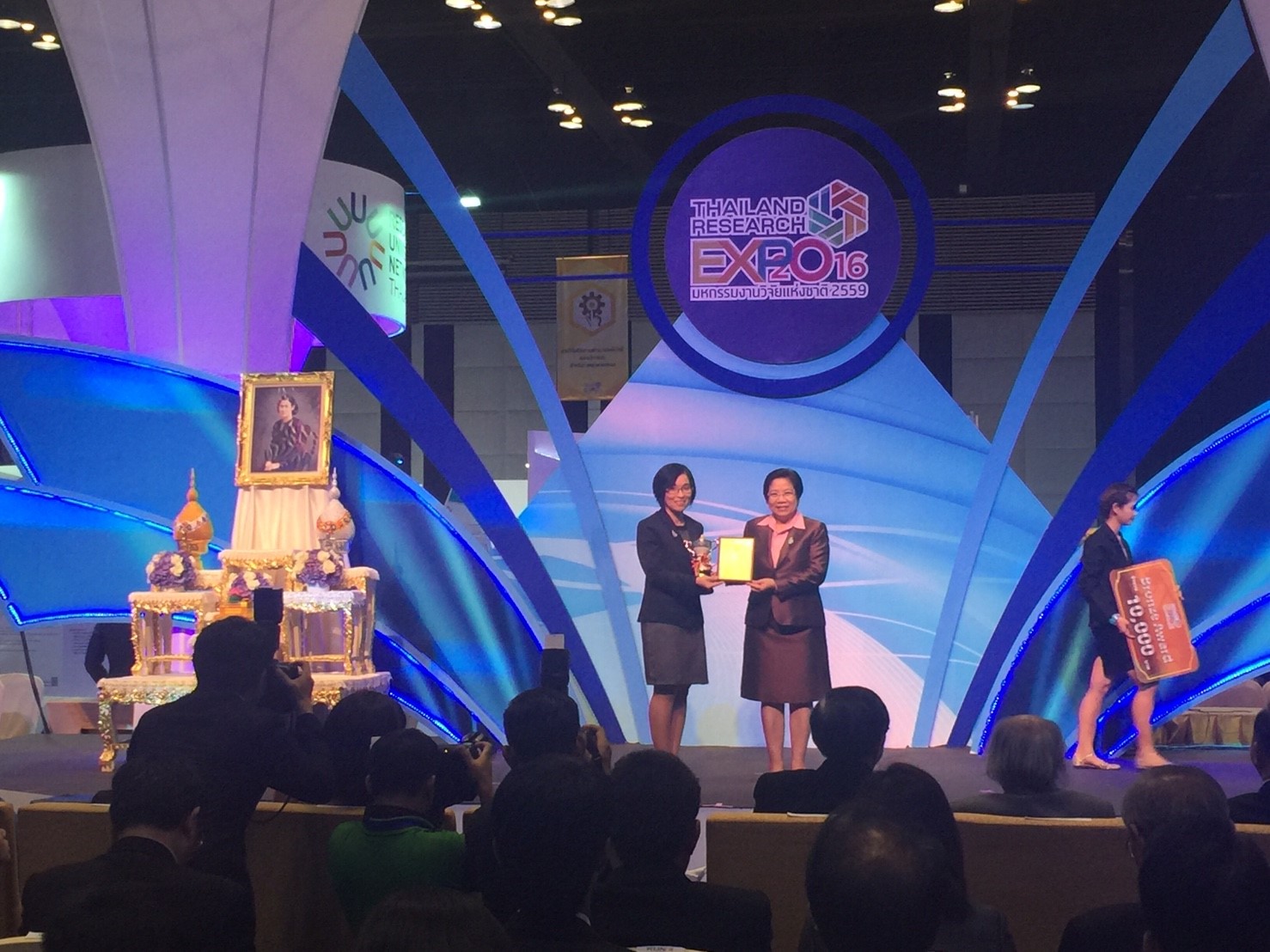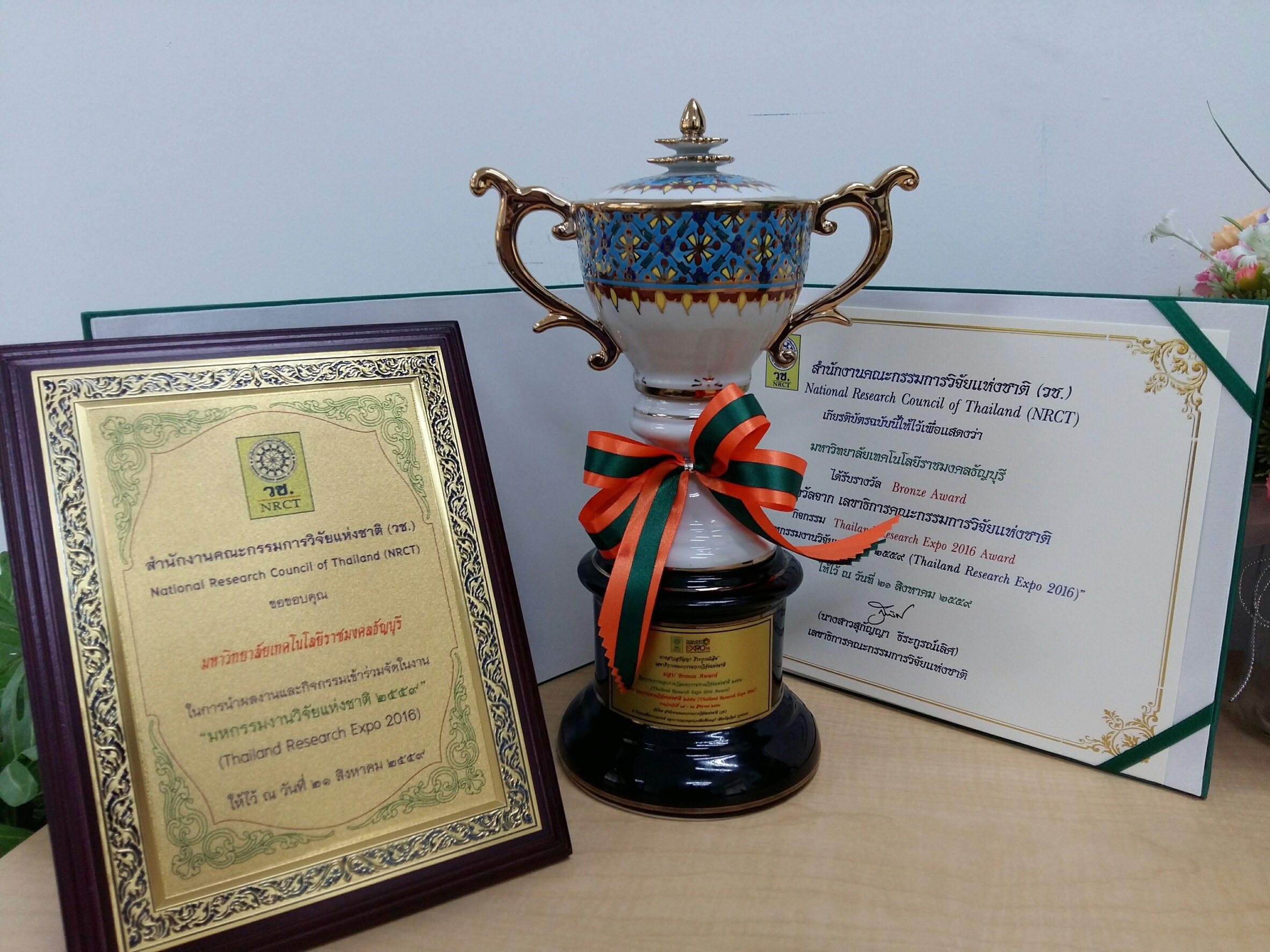 ทั้งนี้ได้รับเกียรติจาก ผศ.ดร.วารุณี อริยวิริยะนันท์ ผู้อำนวยการสถาบันวิจัยและพัฒนา เป็นตัวแทนมหาวิทยาลัยในการรับโล่ เกียรติบัตรและถ้วยรางวัล Bronze Award จาก เลขาธิการคณะกรรมการวิจัยแห่งชาติ ในวันอาทิตย์ที่ 21 สิงหาคม 2559 ณ โรงแรมเซ็นทาราแกรนด์ และบางกอกคอนเวนชั่นเซ็นเตอร์ เซ็นทรัลเวิลด์ กรุงเทพฯ