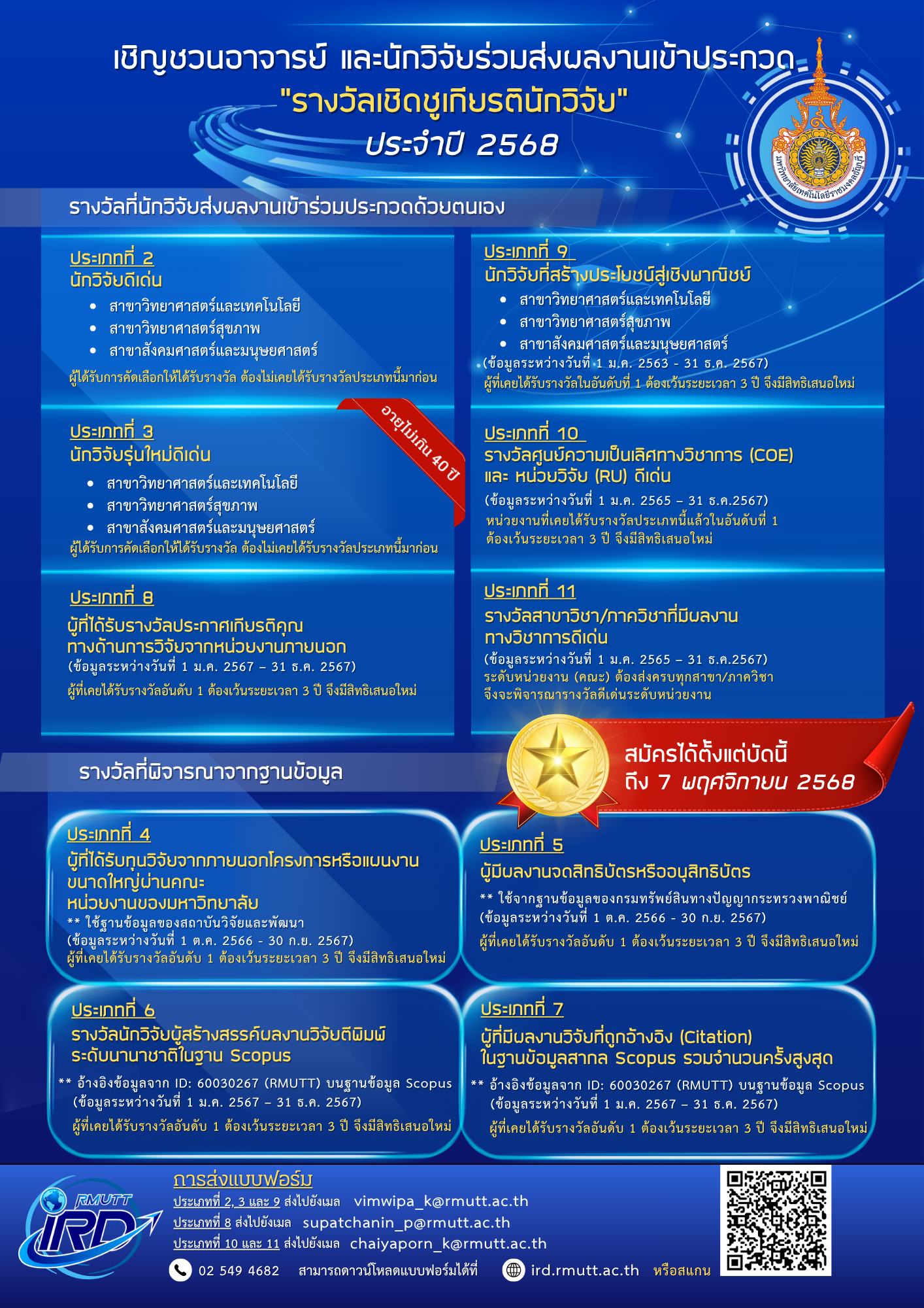 ขอเชิญส่งผลงานเข้าร่วมการประกวด “รางวัลเชิดชูเกียรตินักวิจัย” ประจำปี 2568